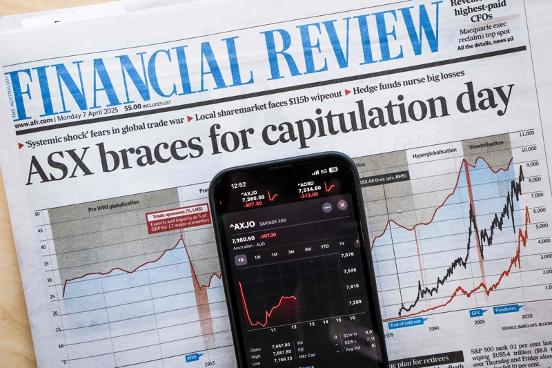 4月7日,澳大利亚悉尼,一份当地金融行业报纸的当日头版和手机显示的澳大利亚股市行情。