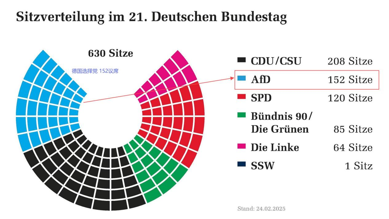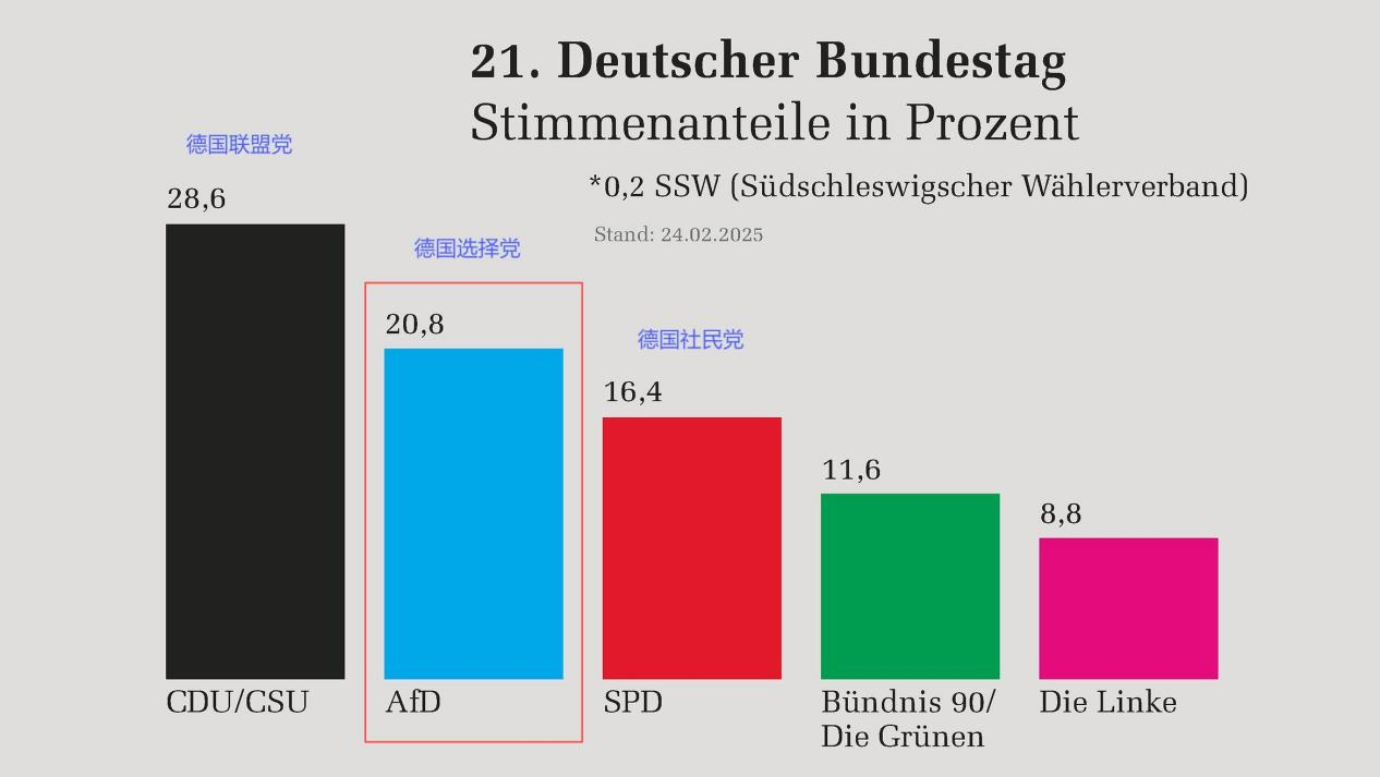 在今年2月举行的德国联邦议院(议会下院)选举中,德国选择党以约20.8%的得票率排名第二,排在联邦议院第一大党联盟党之后,并且领先于社民党。新一届德国政府将于5月6日成立,德国选择党将成为新一届联邦议院最大的反对党。