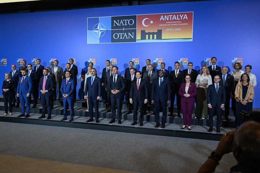 5月15日,土耳其安塔利亚,在即将进行的乌克兰与俄罗斯和平谈判前,北约秘书长马克·吕特(中)与外长们合影。