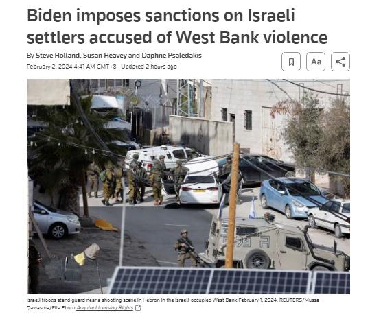 美国国家安全顾问杰克·沙利文在一份声明中表示,拜登签署的这项行政命令建立了“一个制度”,包括对袭击或恐吓巴勒斯坦人,以及夺取其财产的个人,实施金融制裁和签证限制。