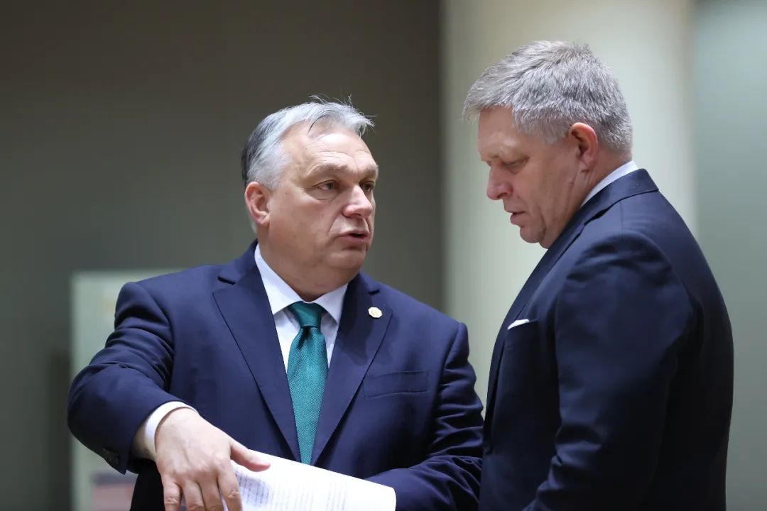 2月1日,匈牙利总理欧尔班(左)在比利时布鲁塞尔出席欧盟特别峰会期间同斯洛伐克总理菲佐交流。新华社发