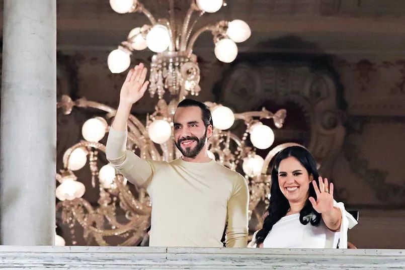 2 月 4 日,在萨尔瓦多首都圣萨尔瓦多,布克尔和妻子在总统府的阳台上向支持者致意 新华社/美联