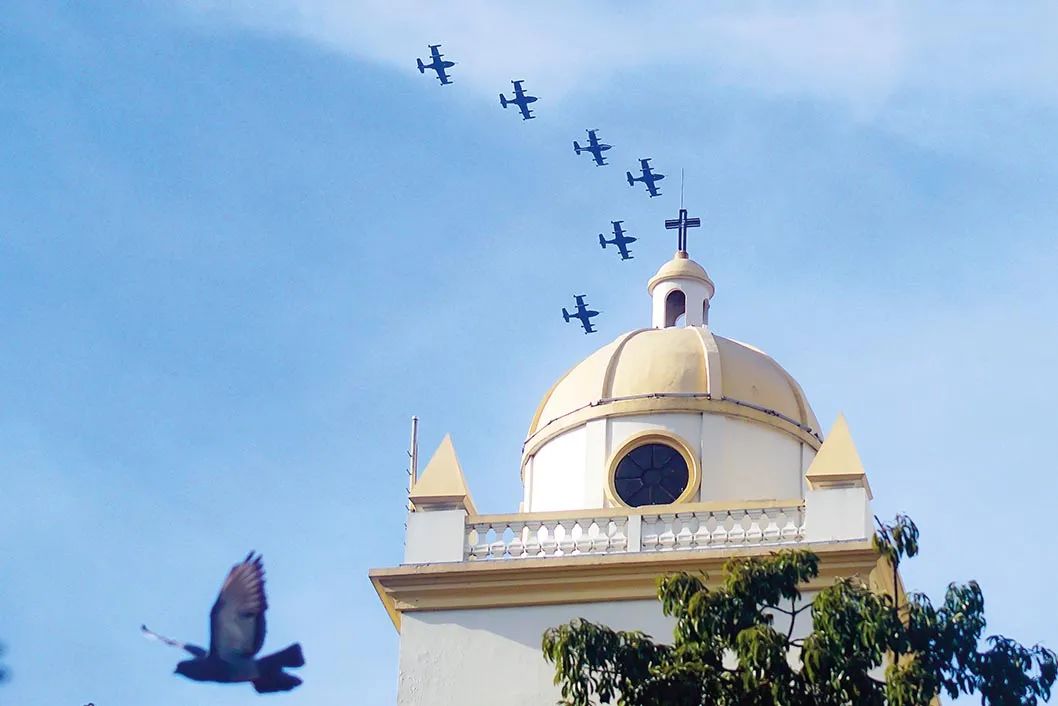 2021 年 9 月 15 日,萨尔 瓦 多 庆 祝 独 立 200周年。图为当天飞机编队在萨尔瓦多首都圣萨尔瓦多参加庆祝仪式 新华社发 (亚历山大·培尼亚摄)