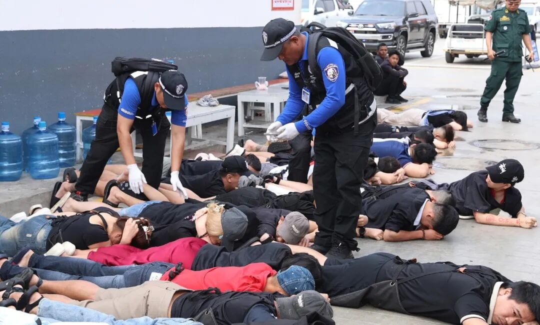柬埔寨警方捣毁诈骗窝点现场,多名涉案人员被控制在地。