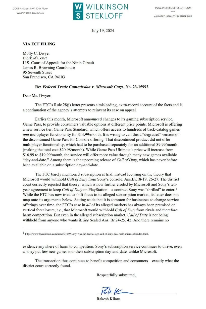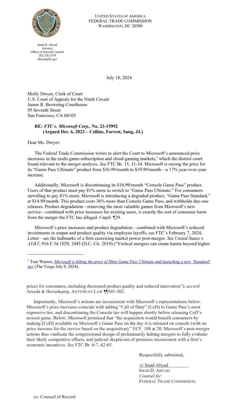 7 月 20 日消息,微软公司今天向美国上诉法院提交反诉文件,就 Xbox 涨价事件,认为美国联邦贸易委员会(FTC)此前提交的文件存在“误导性”。