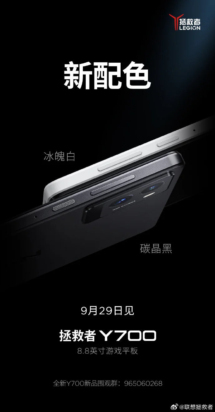 9 月 28 日消息,联想拯救者今日宣布新一代 Y700 游戏平板将推出冰魄白、碳晶黑配色,9 月 29 日发布。