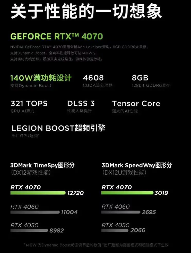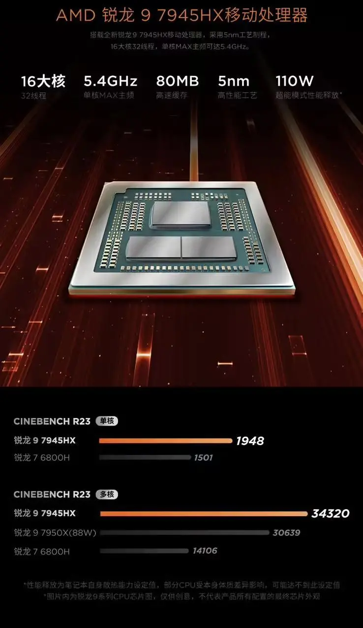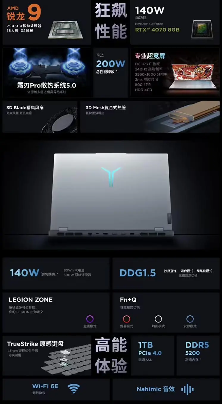 该机搭载 16 核心 32 线程 AMD 锐龙 9 7945HX 处理器,配备 16GB DDR5 5200MHz RAM 及 1TB PCle 4.0 固态硬盘,使用 140W RTX4070 显卡,采用了霜刃 Pro 散热系统 5.0,整机性能释放可达 200W(注:CPU 及 GPU 分别可达为 100W、140W),支持独显直连。