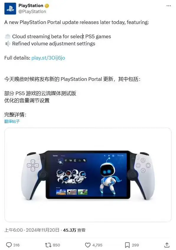 今天,索尼宣布将为 PlayStation Portal 提供系统更新,新增 PS5 游戏(暂不支持 PS3 和 PS4 游戏)的云流媒体 Beta 功能。简单来说就是用户哪怕自己没买 PS5 也能玩了。
