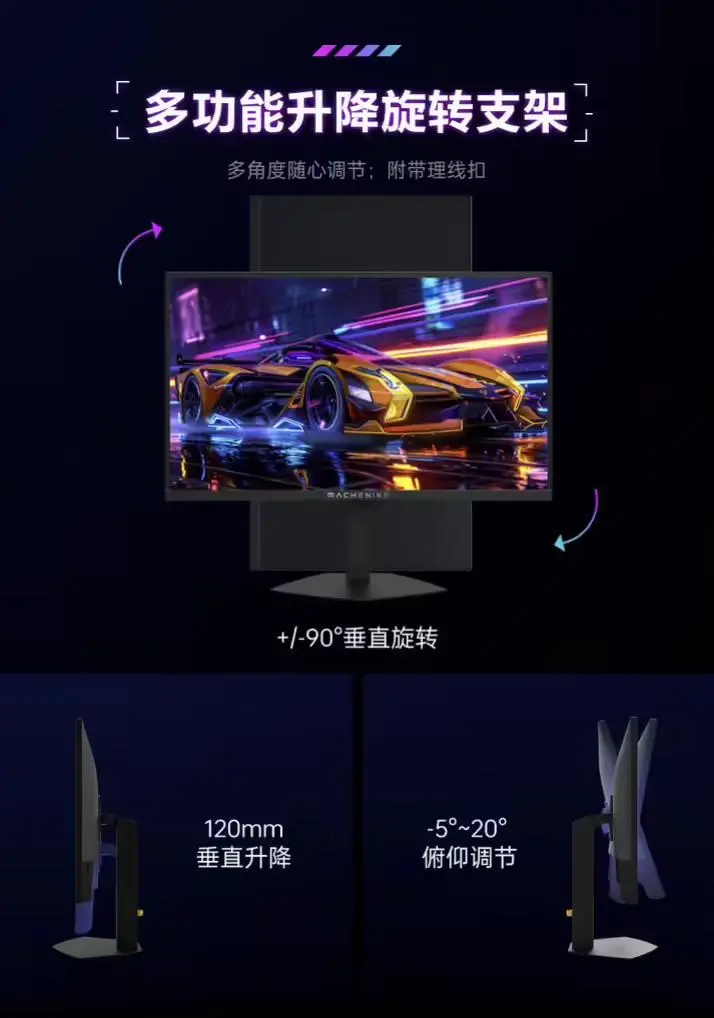 这款显示器支架支持倾斜 / 升降 / 旋转,显示器本体支持 VESA 100x100mm 壁挂,提供 2 个 HDMI 2.0(144Hz)接口、1 个 DP1.4(180Hz)接口。
