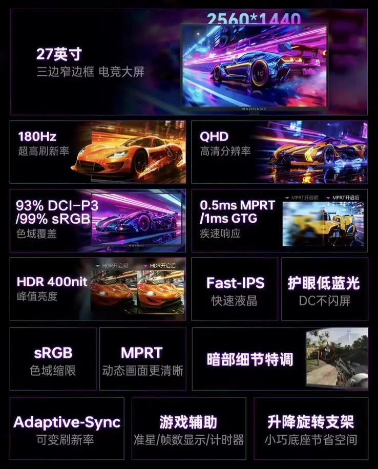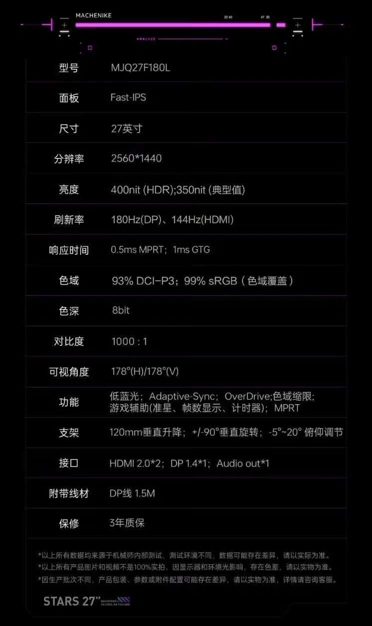 这款显示器配备 2560x1440 分辨率 180Hz Fast IPS 面板,显示器亮度至高 400 尼特,MPRT 响应速度 0.5ms,静态对比度 1000:1,显示器支持 8-Bit 色彩,覆盖 93% DCI-P3 色域、99% sRGB 色域。