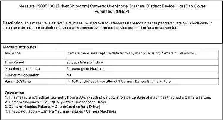 摄像头:用户模式崩溃:独立设备命中数 / 总体数量(Camera: User-Mode Crashes: Distinct Device Hits (Cabs) over Population (DHoP)):指标 ID 49005400,通过统计摄像头用户模式崩溃的独立设备命中数与总体数量的比值,评估摄像头的稳定性和可靠性。