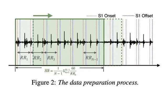 研究使用的是公开的 CirCor DigiScope Phonocardiogram 数据集,总计约 20 小时的心音录音,单段录音时长在 5.1 至 64.5 秒之间。研究团队将音频文件分割为每秒移动一次的 5 秒片段,共生成 23381 个心音片段,用于心率转换测量。