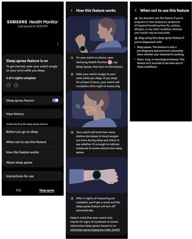 三星表示,只要用户的 Samsung Health Monitor 应用处于最新版本,即可在 Galaxy Watch 上激活“睡眠呼吸暂停检测”(Sleep Apnea)功能。