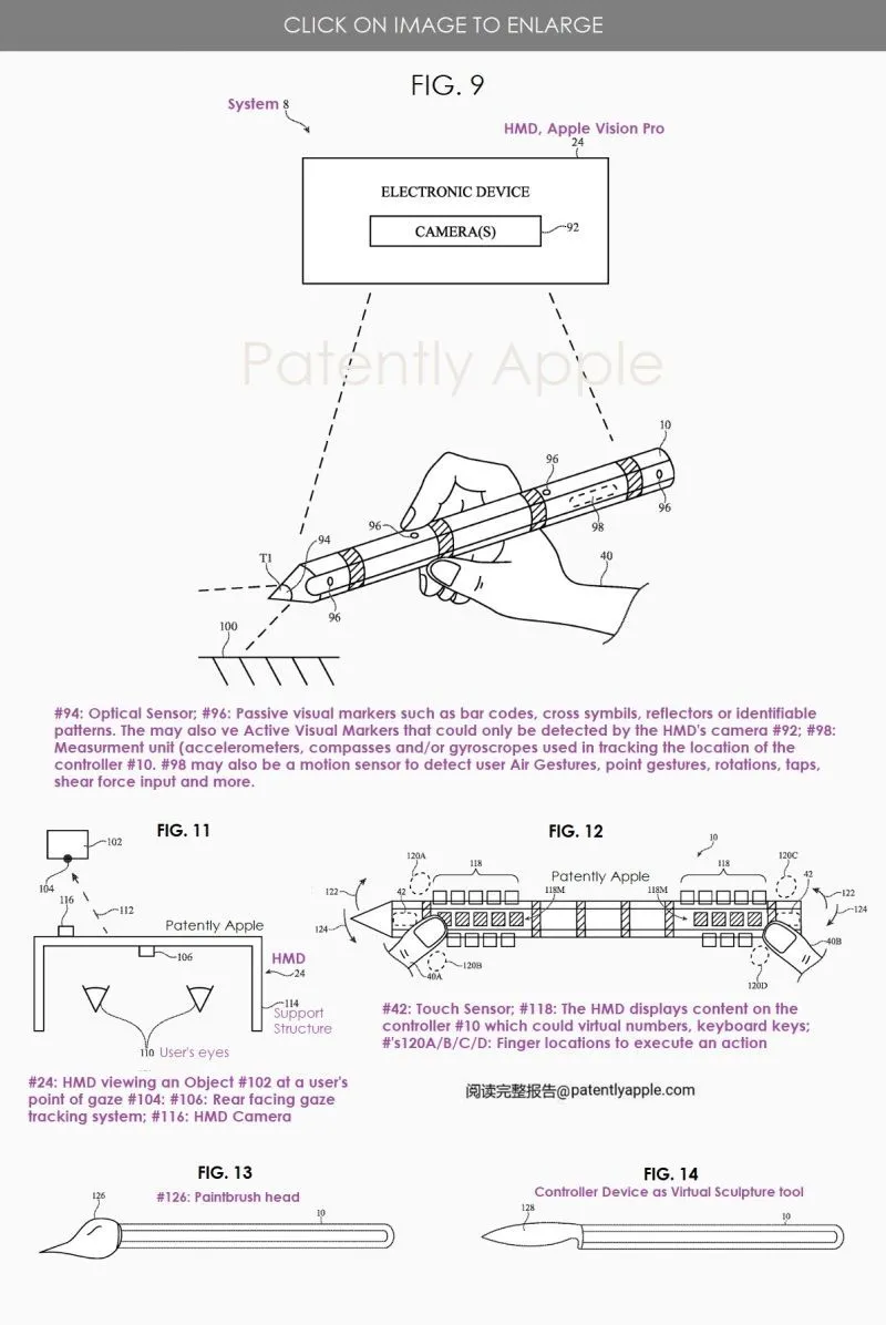 根据专利描述,该控制器虽然采用 Apple Pencil 的笔状设计,但可以拆分成两个不同的组件,用作 Apple Vision Pro 类型设备的控制器。