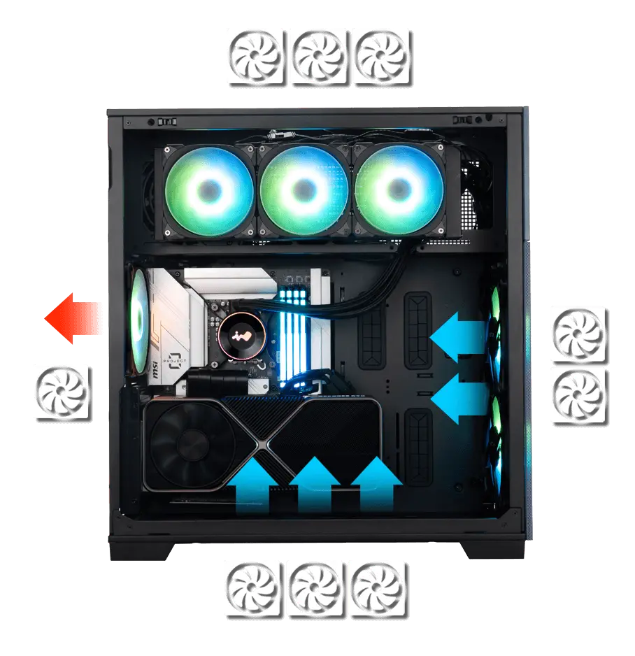 迎广 F5 会根据机身颜色预装三个最新的 AN140 黑色风扇或 AN140P 白色风扇,用户最多可以安装九个散热风扇,而且上方、底部和前方也都能安装水冷排(IT之家注:顶部和底部最大可安装 420 水冷排,前方最大 280)。