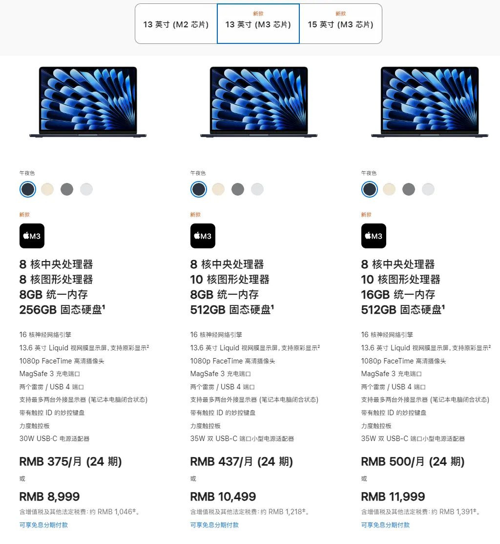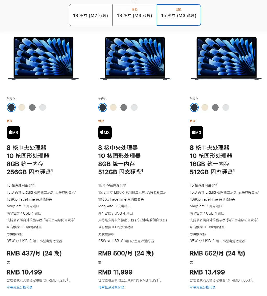 13 英寸 M3 芯片 MacBook Air 起售价为 8999 元,15 英寸机型起售价为 10499 元,最高可选购 24GB+2TB 版本。