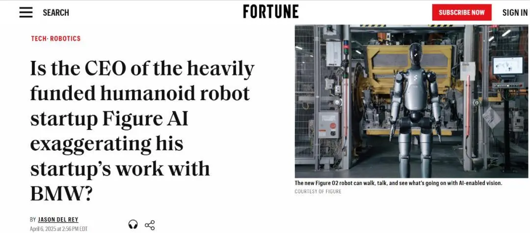 4月6日,《财富》杂志突然发布一篇调查文章,标题是《人形机器人巨头 Figure AICEO 是否夸大了与宝马的合作?》,文章作者是《财富》资深科技记者 Jason Del Rey,他也是《赢家通吃:亚马逊、沃尔玛与我们的钱包之争》(《Winner Sells All: Amazon, Walmart, and the Battle for Our Wallets》)的作者。