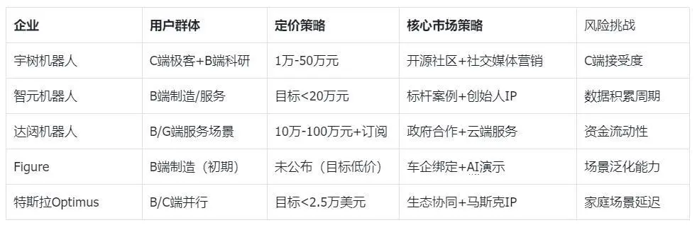 除宇树外,多数企业选择 B 端落地(制造业、服务业),因为场景明确、付费能力强。智元、Figure、特斯拉均强调“家用车级别”定价,但需突破核心零部件降本。未来竞争关键在于 B 端的场景落地速度与 C 端的成本控制能力。