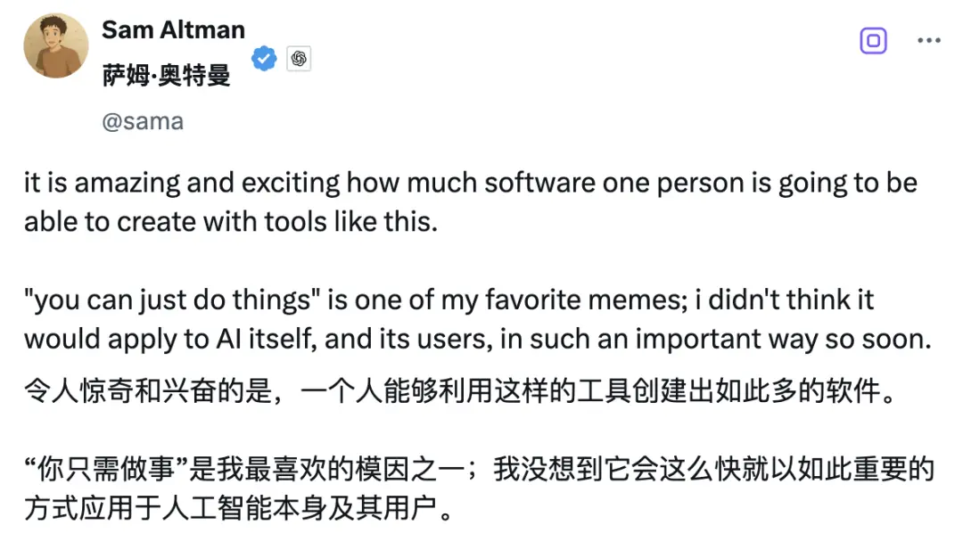 像这样的工具,让一个人能开发出的软件数量,实在令人惊叹又令人兴奋。「你其实可以直接去做」是我最喜欢的梗之一;我原本没想到,它会这么快以如此重要的方式应用到 AI 本身以及它的使用者身上。