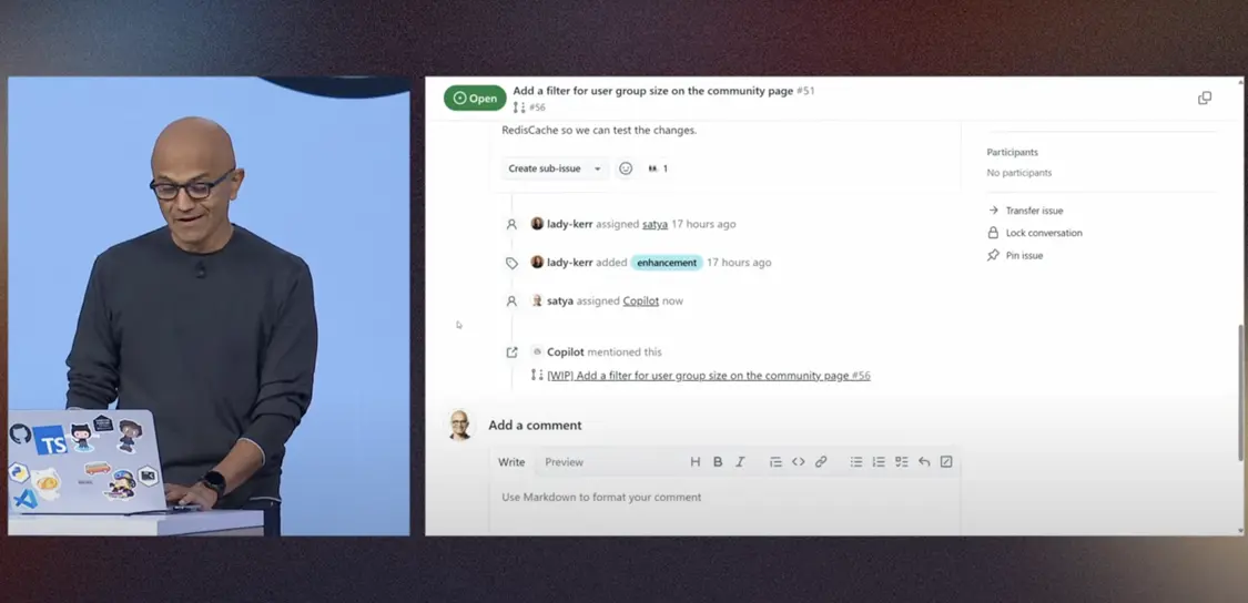 根据纳德拉的说法,这意味,GitHub Copilot 正从「结对编程」演变为「同伴编程」,开发者可以将问题分配给 Copilot 进行错误修复、新功能开发或代码维护,它将自主完成这些任务。