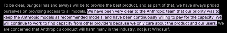 “需要明确的是,我们的目标过去是、将来也永远是提供最好的产品。作为其中的一部分,我们始终为能够提供所有模型的访问权限而自豪。我们已经非常清楚地向Anthropic团队表明,我们的首要任务是让Anthropic模型作为推荐模型,并一直愿意为获得其算力付费。我们将继续努力从其他供应商那里寻找算力,因为我们只关心产品和我们的用户。我们担心Anthropic的行为将伤害业内许多人,而不仅仅是Windsurf。”