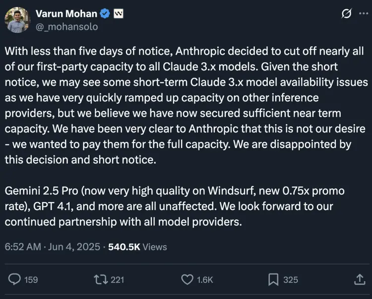 这是Windsurf CEO Varun Mohan在当地时间6月4日发布的一条略显无奈的推文。作为目前最受欢迎的AI编程工具之一,Windsurf突然收到了来自Anthropic的“分手通知”,后者决定切断对Windsurf的Claude 3.x系列模型直接供应,包括Claude 3.5 Sonnet、3.7 Sonnet以及3.7 Sonnet Thinking这些深受开发者喜爱的版本。
