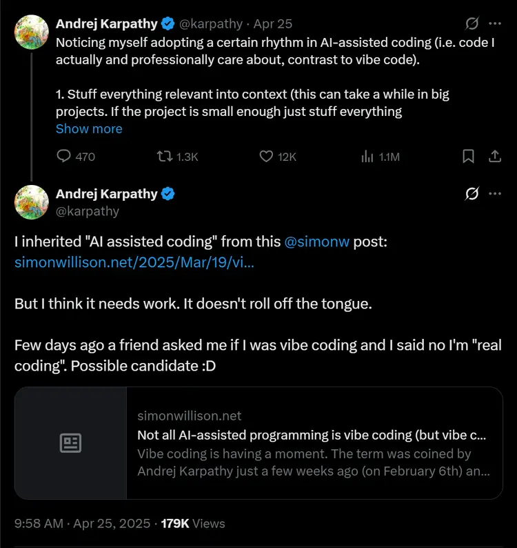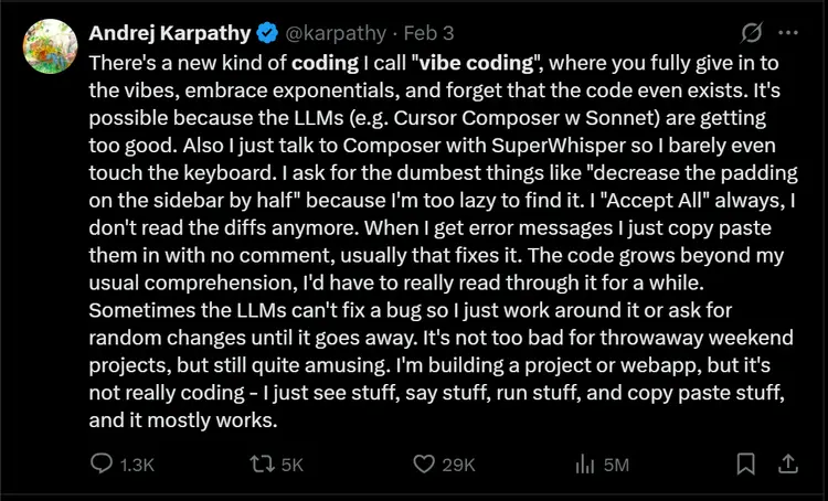这一切都始于2025年2月,OpenAI的创始团队成员、前特斯拉AI总监Andrej Karpathy在X上的一条推文。