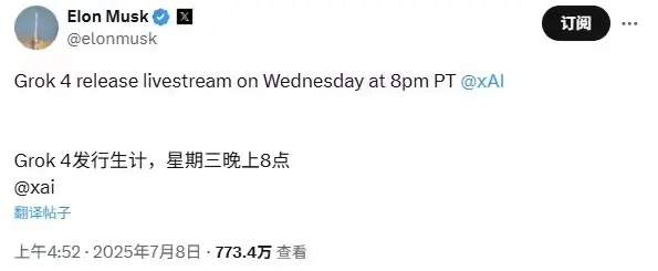7月8日,马斯克发帖宣布xAI新一代Grok 4大模型将于太平洋时间周三晚8点发布,即北京时间周四上午11点,届时将在X上开启直播。