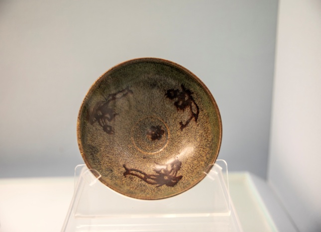 宋代民窑吉州窑烧制的黑釉剪纸贴花三凤纹碗