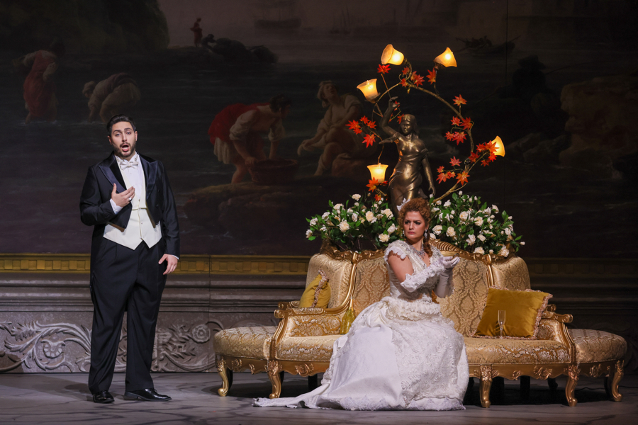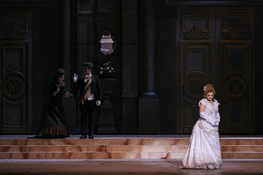 本场饰演女主角薇奥莱塔的女高音卢克蕾齐娅·德雷是歌剧的重头戏。薇奥莱塔在这部剧中戏份最多,所有戏剧矛盾皆围绕她展开,颇为考验女高音的功力。德雷对乐句的语气处理堪称精妙,作为意大利人,对意大利语的表现绝对信手拈来,大量自由节奏的处理尽显自如。尽管第一幕似未完全开嗓,音色略显疲惫,但是随着歌剧展开,第三幕时已游刃有余。