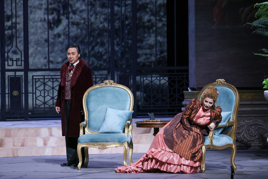 本场最值得称赞的是饰演老阿芒的男中音歌唱家廖昌永。他30岁时就曾在台北主演《茶花女》中的阿芒。几十年的舞台经验和精心打磨,让他对这一父亲角色有极为深刻的洞察。在第二幕与薇奥莱塔的二重唱以及咏叹调《普罗旺斯的陆地与海洋》中,他细腻精湛的音乐处理赢得了观众阵阵喝彩。当晚廖昌永对阿芒的诠释绝对堪称教科书级,唱演俱佳的舞台诠释让人赞叹不已。