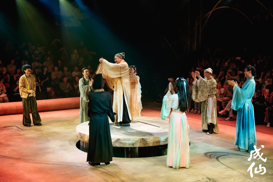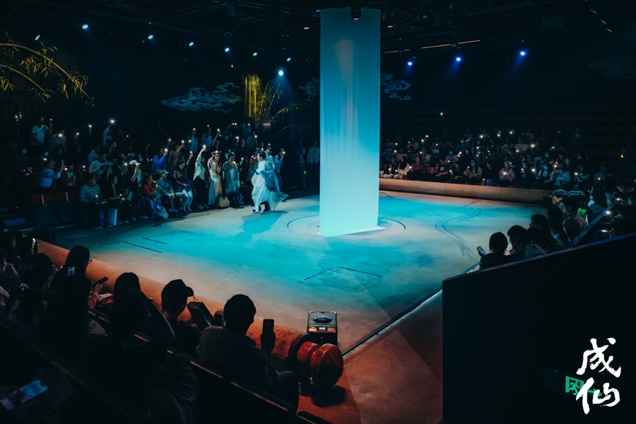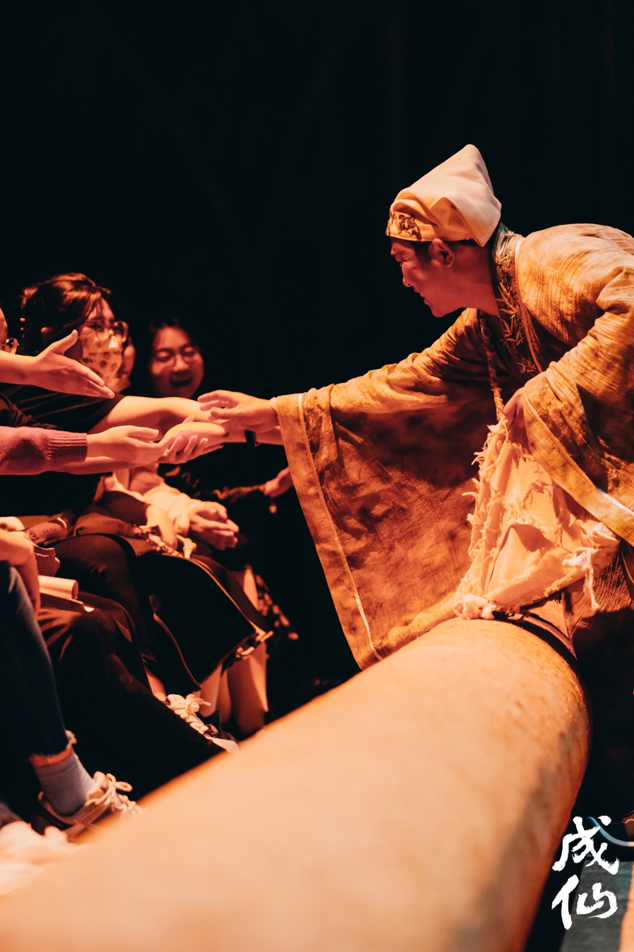 140平方米《成仙》舞台被象征中国传统文化中的“金、木、水、火”四种元素的四面观众席共375个座椅环绕,而中央舞台区域恰恰象征“土”方位。演员每个动作、走位,都花费了数倍时间排练。