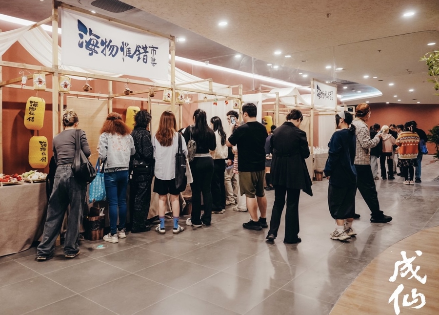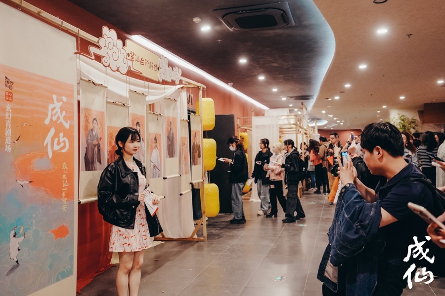 经过几年磨合,开心麻花从一些商场撤出,暂停部分沉浸式剧目。“商场里的剧场”大方向没有变,落地操作却在螺旋式升级,有了更进一步的文旅商融合模样——《成仙》所在的地方不叫剧场,而是顺应剧情称为“道场”。与之相关的主题商户联动入场做市集,观众在场外即可体验“占卜”剧情,穿上剧中魏晋风格古装打卡拍照,再入场观剧,情绪价值拉满。