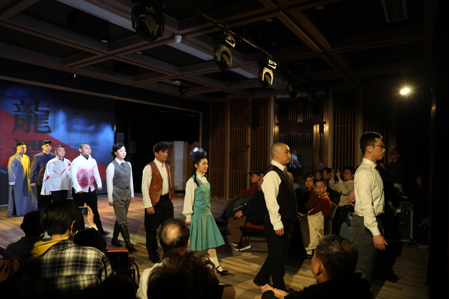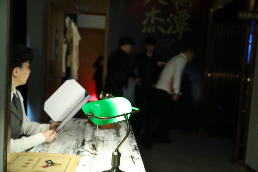 副导演孙伟带领同事正在新空间打磨《龙潭英杰》。“男主角的办公室旁边有审讯室、枪械库,观众一入场,楼道就有环境音响起。”孙伟叮嘱大家全神贯注,进入角色,“从观众入座到开演之间的15分钟,气氛要铺满。比如演警察的人,看到观众要上下打量,有一种审视的意味。”