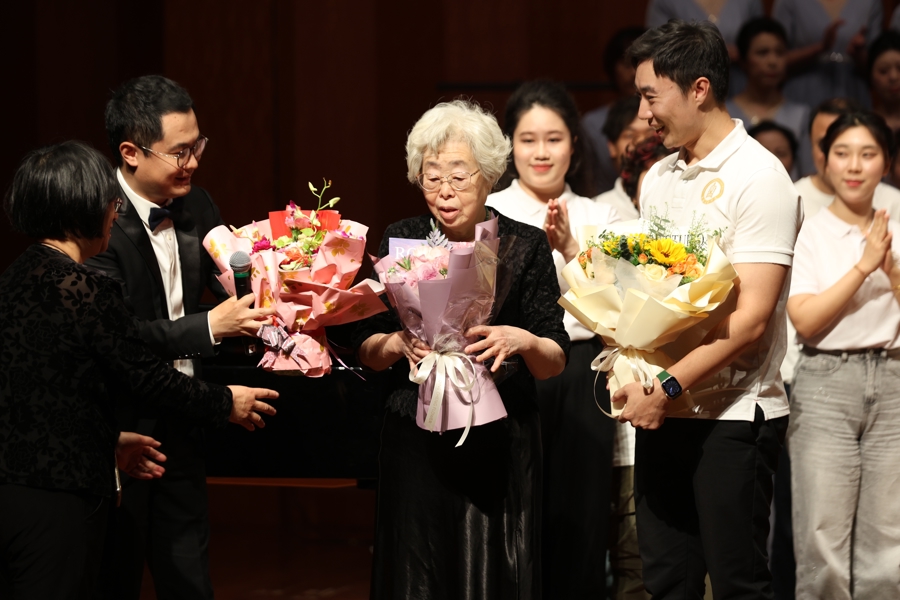 音乐会以《萱草花》拉开序幕,这首承载着母爱温暖的歌曲由上海音乐学院教授钱亦平担任钢琴伴奏,由毕业于上音的福美志愿者刘丞彬执棒。钱亦平虽长期忍受病痛,仍坚持公益事业,也是福美公益长期捐助人,她的奉献精神令全场动容。