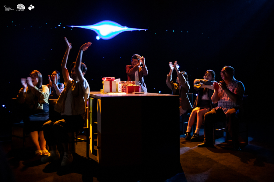 开幕式打破常规镜框式舞台,将剧场固定观众席拆卸,剧场空间横摆,采用中心式舞台,营造出沉浸式沙龙派对的现场氛围。开幕式演出以舞台短剧的形式呈现,通过展现一位大学生的内心冲突,渴望借助话剧节平台,汲取舞台力量、迈入人生正规的故事,传达出组织方坚持20年举办大学生话剧节的初衷和意义。“剧场精灵”拟人化的多媒体表达,热烈奔放的音响效果,氛围浓郁的灯光等技术手段,创造出一场炽烈有声的青春派对。